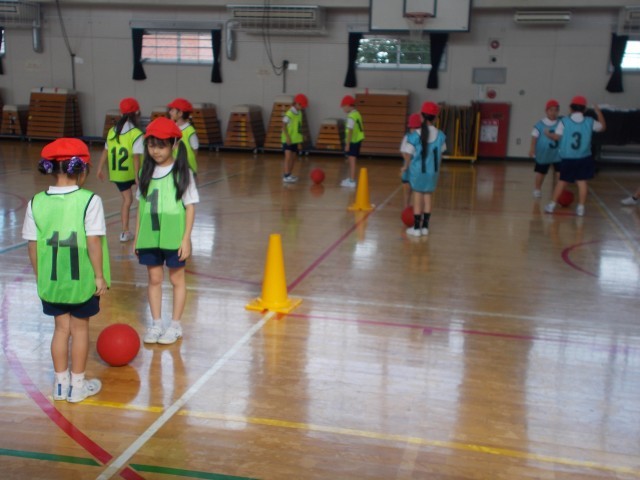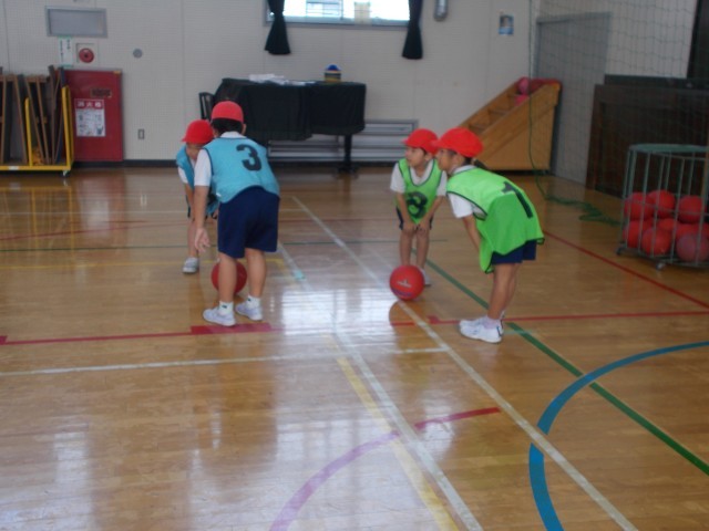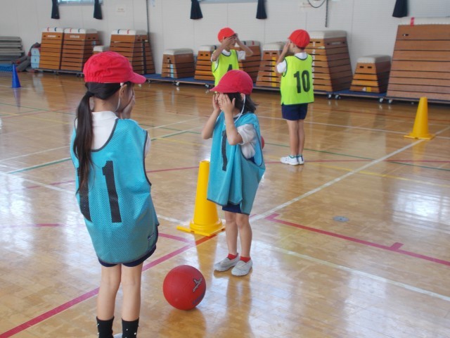 ボール運動に取り組んでいました。先生が「つま先」と言えばつま先をタッチし、「目」と言えば目をタッチします。そして、最後に「ボール」と言ったら、互いにボールを取り合います。よく聞きすぐに動かないと相手にボールを取られてしまいます。楽しく取り組んでいました。