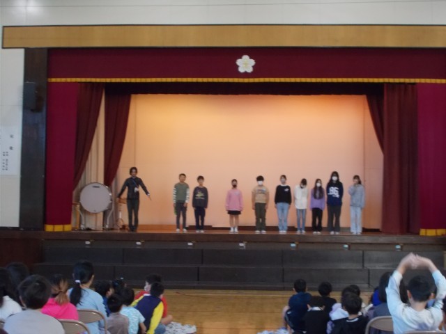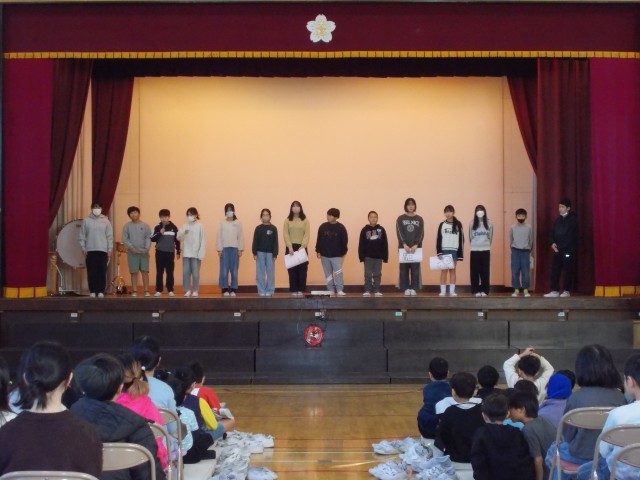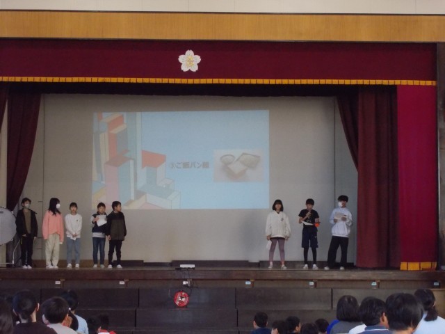 環境・給食・保健委員会からの発表がありました。委員会の活動を理解してもらえるように、スライドを使ったりクイズを出したりしながら、説明していました。