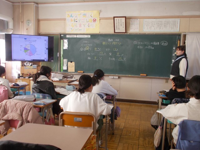 1組、2組、算数少人数の教室に分かれて学習しています。割合の学習です。東京で育てられている果樹の割合を求めていました。1位は栗だそうです。想像してたものとかなり違っていて驚きました。