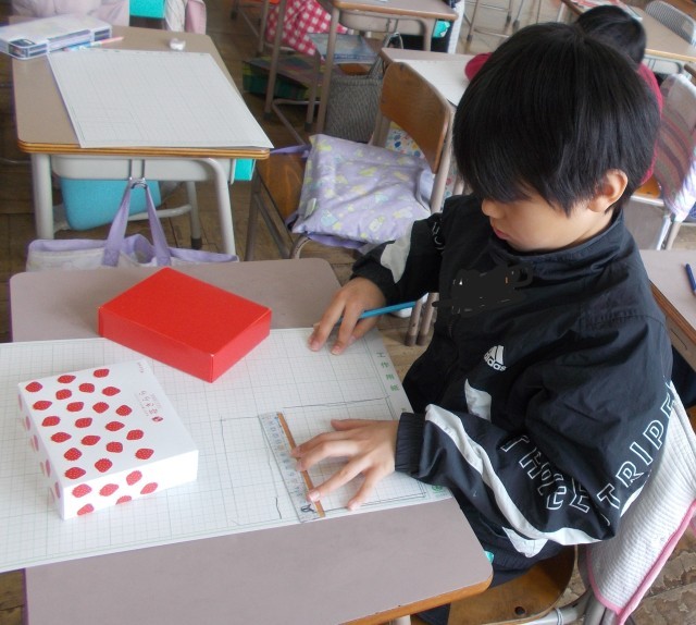 箱の面を工作用紙に写し出し、箱の面の形や数に注目させていました。慎重に写し出していました。