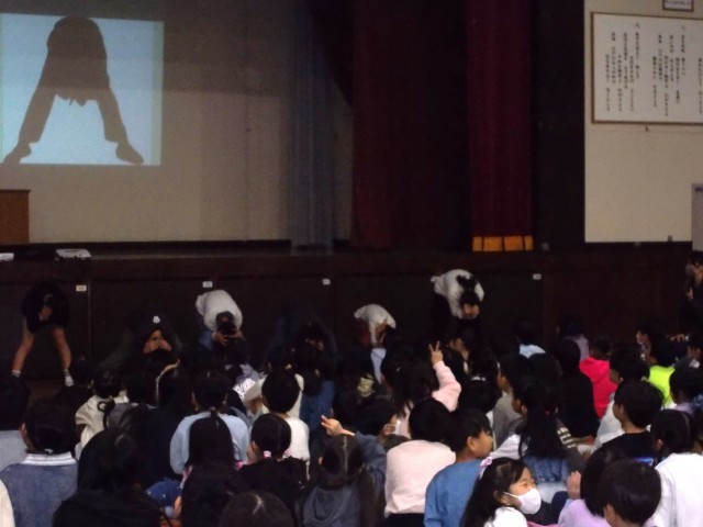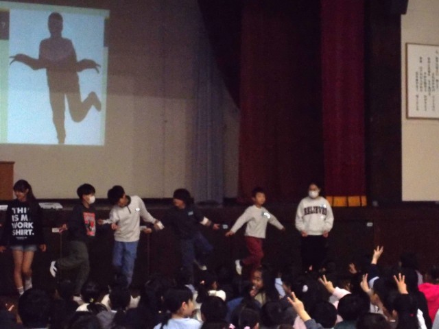 児童集会で、「先生シルエットクイズ」をしました。シルエットから、先生が誰かをあてるクイズです。先生たちは皆、工夫したポーズをしているので、なかなかあてることが難しかったです。