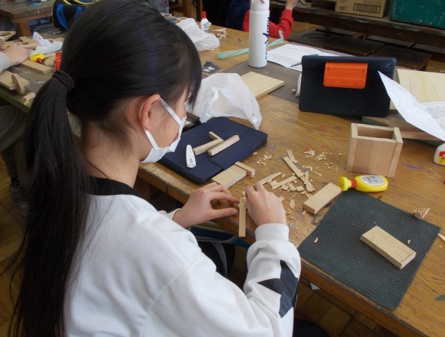 1枚の板を切って、自分の作りたいものを作っていました。おにぎり、カルガモ、サッカー等、自分の好きなものづくりに没頭していました。