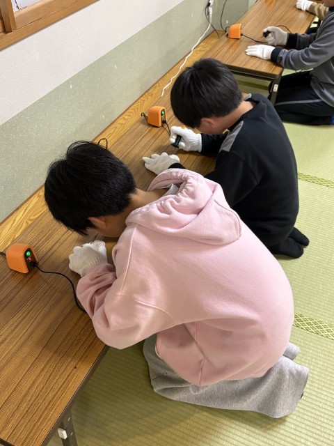 1日目の夜は、ウッドバーニングをしました。浅草山荘の広場で拾った木を加工し、キーホルダーにします。素敵なデザインを彫ることができました。
