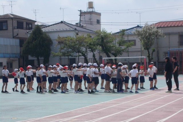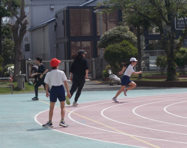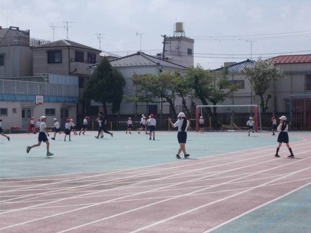 5年生は学年で合同体育を行っていました。短距離走のタイムを計ったあと、担任の先生2人がオニになり子供達を追いかけていました。最後は笛の合図で整列です。
