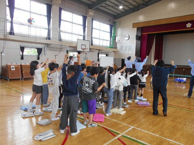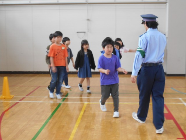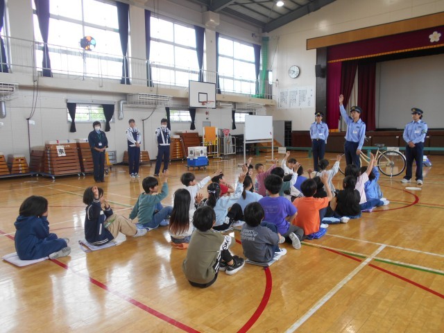 雨のため、実際に校庭で自転車を使った実技は行えませんでしたが、体育館でブレーキのかけ方や安全確認の仕方を学びました。