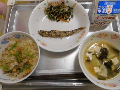 鶏ごぼうご飯/ししゃものごま付け焼き/小松菜の磯香和え/豆腐とわかめのみそ汁