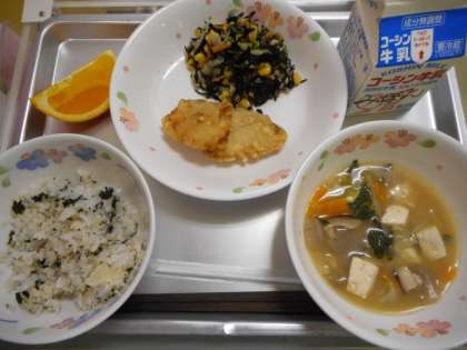 わかめご飯/タラの竜田揚げ/ひじきと鶏のサラダ/たぬき汁/オレンジ