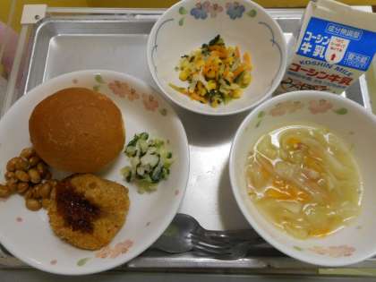 大豆が苦手な子のために、とクラッカンとしてデザートにしてみましたがイメージ通りにいかず…。そんな中2年2組を訪問しました。最初に「一口食べたら減らしてみて〜」と言うと「もっとほしい」とたくさんの子が手を上げ、結局2組はボウルが空になりました。カリカリ食感を目指していたので今後の課題です!