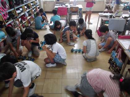 4年の教室では、理科の電池のお勉強で作った車で友達と楽しむ子どもたちの姿が見られました。
