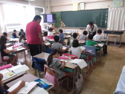今日も静かな学校生活かなと思っていたら、窓の外から「みなさん、おはようございます!」と元気な声が聞こえます。2年生の教室からです。早速のぞいてみると、教育実習生が国語の授業をしています。みんなしっかり板書の課題をノートに書いています。
