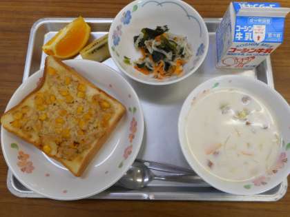 ツナコーントースト/ソーセージのミルクスープ/じゃこのカリカリサラダ/オレンジ・キウイ