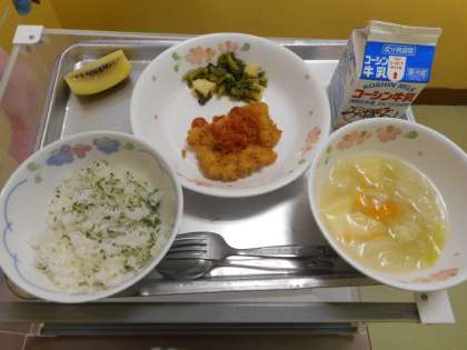 子どもの様子を見ると、チキンフライが大人気に思えました。どの学級も食缶が空になっているようでした。