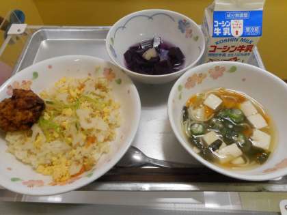 7月7日は七夕です。今日は七夕の夜空に浮かぶ星や天の川をイメージした献立にしました。汁には星形のかまぼこと天の川のそうめん、ゼリーには夜空のグレープゼリー、星形のナタデココとパインを入れました。グレープゼリーの色がパインに移ってしまい残念…来年はもっと綺麗なデザートにできるといいです。
