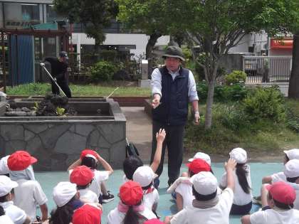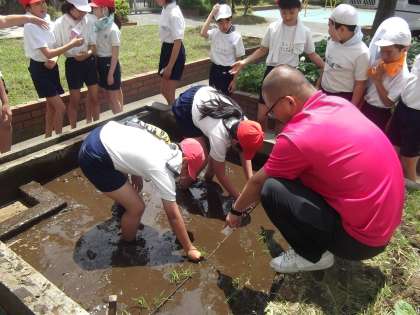 晴天のもと、JA鶴岡市の方のご指導を受け、5年生が田植えを行いました。品種は「はえぬき」です。戦争中、疎開をさせていただいたつながりから、今でも交流を行っています。今から収穫が楽しみです。