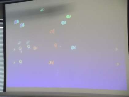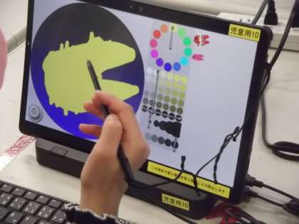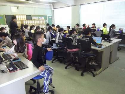 1年生が、パソコン室で「プログラミング学習」をしていました。みんなで水族館を作ったようです!