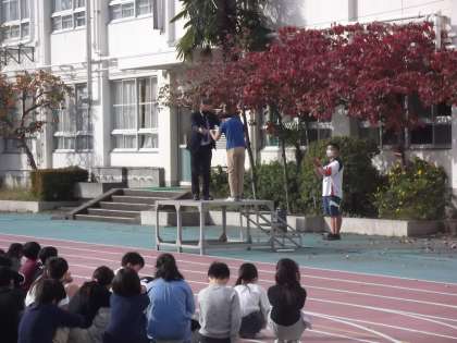 今朝の全校朝会では、読書感想文学年代表児童の表彰がありました。6年生の児童が代表して表彰状を受け取りました。委員会の紹介も行いました。校長先生からは、「霜柱が見られたことで、秋が終わりです。」というお話がありました。今年もいよいよ残り2か月となりました。