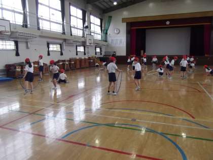コオーディネーショントレーニングの授業をJACOTの講師の先生と一緒にしました。運動感覚づくりの学習に夢中で取り組み、歓声が体育館の外まで響いていました。