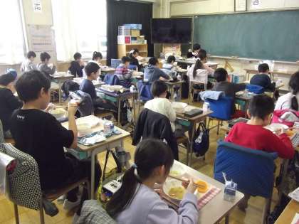 今までのグループでの給食ではなく、授業のように全員が前を向いて食べています。今週の目標は「給食の時間は静かにしましょう」です。実行できていますね。