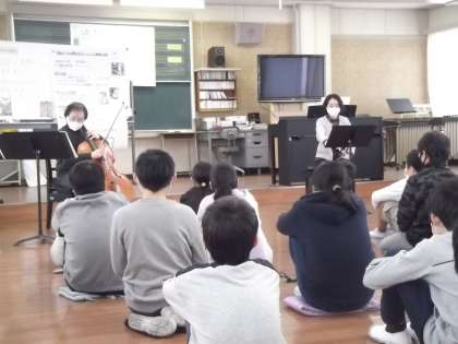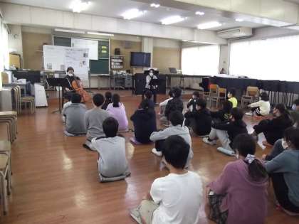6年生の音楽の授業では、「ミニ音楽鑑賞教室〜チェロと朗読のコンサート」をしました。セロ弾きのゴーシュ(宮沢賢治:作)の弾き語りです。音楽専科の先生が朗読し、講師の先生がチェロを弾いてくださいました。子どもたちは集中して、目と耳と心で音楽を味わっていました。