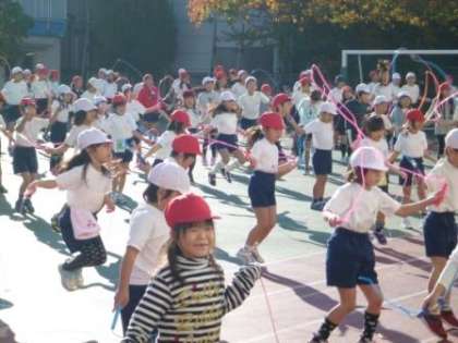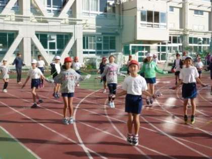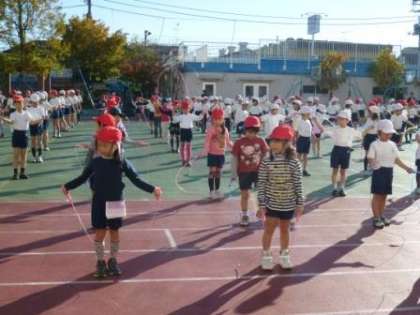 短縄で、リズムなわとびをしました。音楽に合わせて、いろいろな跳び方を組み合わせて数分間跳び続けました。跳んだ後の児童は、さわやかな汗をかいていました。