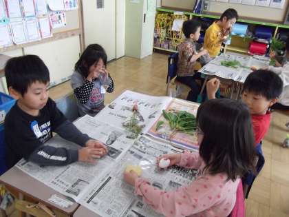 今日は1年生に「食べ物の名前を知ろう ふれてみよう」という授業を行いました。食べ物の名前当てクイズを行い、そのあと実際に食べものに触り、色々な事を発見してもらいました。