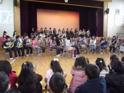 6年生が、1年生のためにブラスバンドでミニコンサートを開いてくれました。色々な楽器の紹介に、興味津々でした。最後に、6年生に演奏に合わせて、校歌を一緒に歌いました。