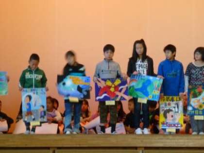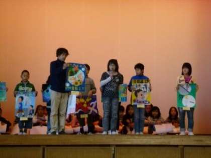 今朝は、環境ポスターの表彰がありました。各学年とも、工夫をこらした作品でした。
