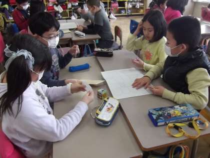 1月25日(金)スクールカウンセラーの先生による、フレンドシップが行われました。この活動は、「人を信頼して協力することの大切さ」や「自分たちで問題を解決していける力」を身に付けるねらいがあります。今回は、24枚のカードに書かれている情報をグループ全員でうまく伝え合い、商店街の地図に「どこに何のお店があるか」を書き入れて完成させる活動を行いました。最初は自分の意見しかお互いに言えなかった子ども達も、相手の意見を聞き入れながら地図を完成させることができました。