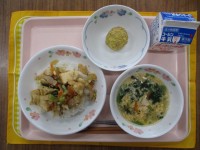 ご飯 レバーの竜田揚げ きゃべつのからし和え 豆乳入りみそ汁 牛乳