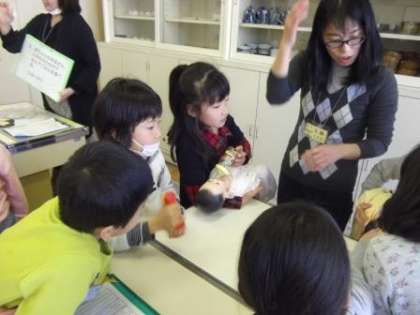 2月28日(木)に生活科の学習で「赤ちゃんお母さん体験」がありました。はじめに助産師の竹内さんから、お腹の中の赤ちゃんについてお話を聞き、お手伝いに来てくださったお母さんたちからも妊娠中のことや生まれた時のことなどをお話ししてもらいました。大切に育てられた「命」を大切にすることや、自分だけでなく友達の「命」を大切にすることを学びました。