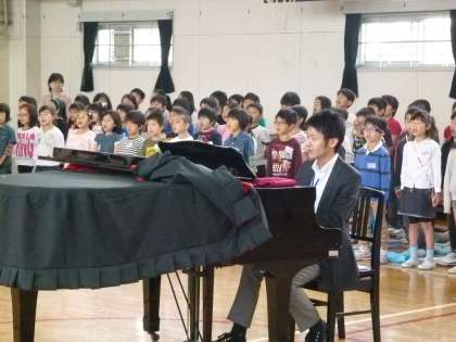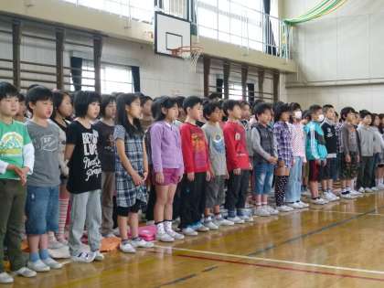 今日は音楽朝会ありました。1年生を迎える会の練習で「森のくまさん」を歌いました。2、3年生が1番、4、5年生が2番を歌い、6年生はそれぞれを追いかけて歌いました。1年生のために大きな声でしっかり練習ができました。