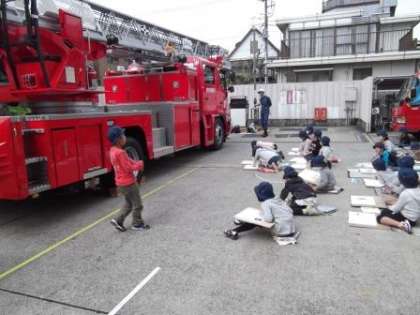 1、2年生の子供たちが大きな消防車を前にして、画用紙いっぱいにクレヨンで描きました。本物の迫力に負けないくらい、いきいきとした作品が出来上がりました。
