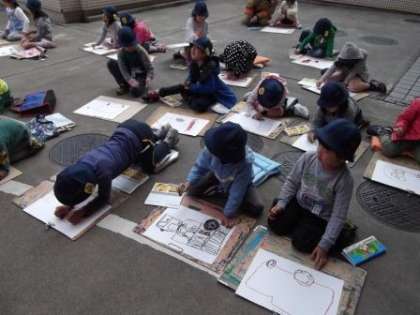 1、2年生の子供たちが大きな消防車を前にして、画用紙いっぱいにクレヨンで描きました。本物の迫力に負けないくらい、いきいきとした作品が出来上がりました。