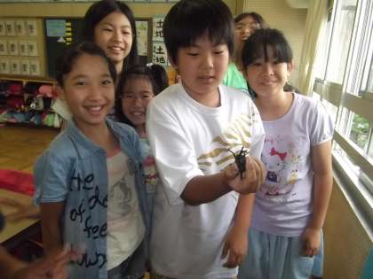 以前、児童が持ってきてくれたカブトムシの幼虫が成虫となり、誕生しました。児童も大喜びで、手にのせたり服にくっつけたりしていました。引き続き、大切に育てていきます。