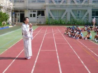 7月19日・20日に行われる五南町会の盆踊りに向けて、全校朝会に続けて、盆踊りの講習会を行いました。