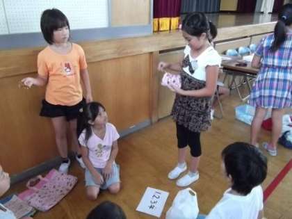 子供たちはスタンプカードを持ってあちこちのお店に回ります。4年生の縁日ではエコキャップをお金にして、遊ぶことができます。写真は上から、5−2:クイズ迷路、4−1:縁日の魚つりゲーム、4−2:縁日のばくだんゲームです。