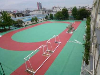 校庭改修工事も、終盤にさしかかってきました。校庭の茶色の部分そして、緑の部分が塗られると、子供達も「もうすぐだね」と工事完了を待っています。
