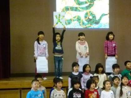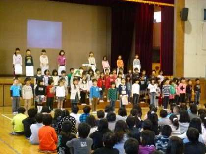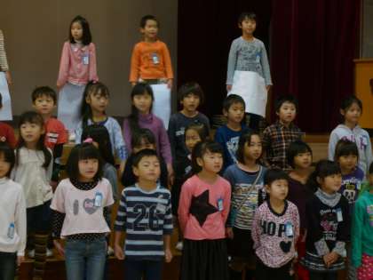 12月11日(水)に表現朝会がありました。「月ようびは なにたべる?」という絵本の読み聞かせをメロディーに合わせてしました。1年生が「なにたべる?」と聞くとほかの学年が「なにたべる?」と聞き返す形で、月曜日から日曜日まで進んでいきます。月ようびは「さやいんげん」火ようびは「スパゲッティ」、水、木、金は何を食べるのか聞いているほうも楽しくなりました。朝から元気な歌声とお兄さんお姉さんたちのやさしいやまびこで、体育館がとてもあたたかくなりました。