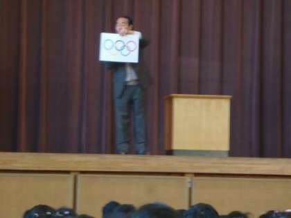 1月20日(月)の全校朝会では、校長先生から近代オリンピックについてお話がありました。オリンピックのマークに使われている色を使うと、ほぼどの国の国旗も表せることができ、さらに五つの輪は五大陸を表していることから、五輪のマークが使われています。