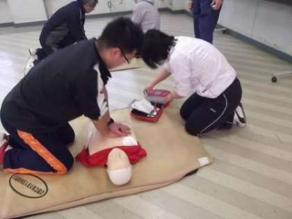 今回はAEDの使用法、心肺蘇生法と、包帯法や止血法などの応急処置を江戸川消防署の方に教えていただきました。