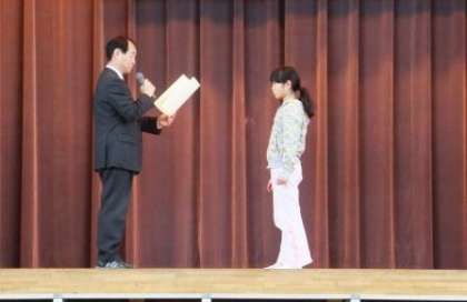 2月24日(月)の全校朝会では、毛筆書き初め展の表彰と、クリーンエイドの表彰がありました。