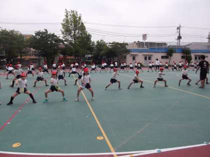 先週、今週と子ども達は暑い中、隊形移動の練習や、腰を低くしたり、指先や視線の向きを決めたりなど細かい動きの確認をしています。