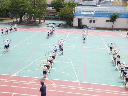 今年の表現は、フラフープを持つことで、難易度も高い、スピードも速いという子供達には大変な演目となりましたが、1ヶ月近く練習を重ね、大分そろって踊ることができるようになりました。一直線にならんで踊ることがどうしても苦手な2年生。本番ではまっすぐならんで踊ることができるでしょうか。