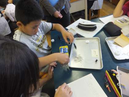 「電磁石に性質」を学習材とし、電磁石の強さの変化を調べ、調べた結果を表に整理し、考察する授業を行いました。