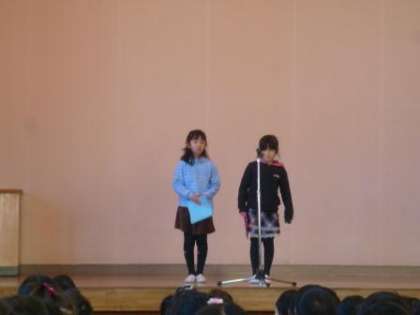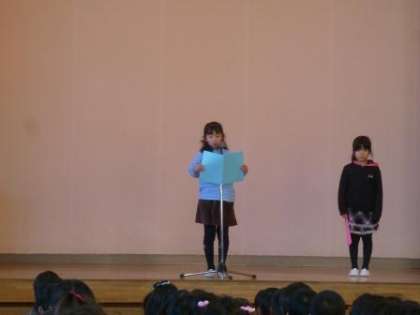 児童代表の言葉では、2年生の児童が3学期頑張りたいことを発表しました。立派に堂々と発表できました。