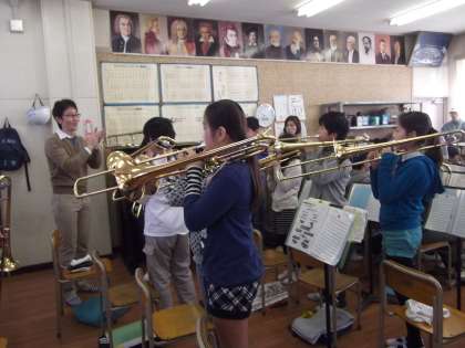 この日は特別に江戸川ウィンドオーケストラの方々に来ていただき、各パートごとに指導してもらいました。