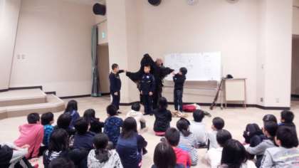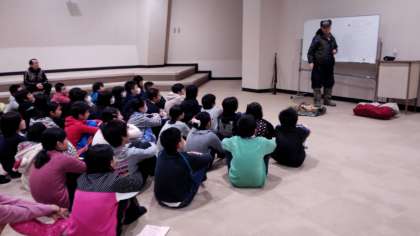 夕食後、地元の猟師の方から熊撃ちの話しを聞きました。本物の熊の毛皮や銃を見せてもらい、子供達はとても興味津々に聞いていました。