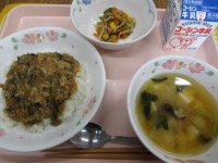 【誕生日給食】豆腐と豚肉の中華あんかけ丼いもとじゃこと大豆の揚げ煮海藻サラダ牛乳