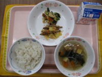 ごはんきびなごのにんにく醬油揚げ青菜のみそ炒め吉野汁牛乳