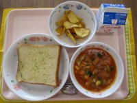 カレーミートチーズドック白菜と大根のスープ煮さつまいものアーモンド揚げりんご牛乳